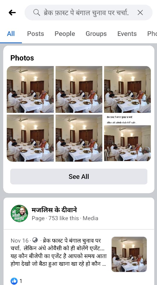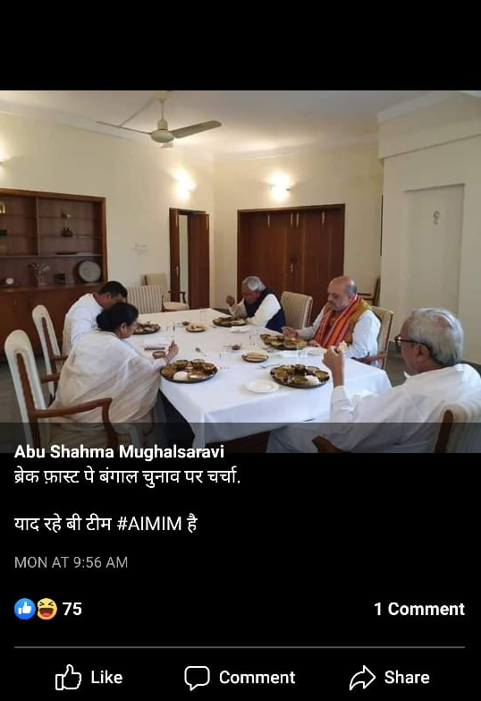 পশ্চিমবাংলার আসন্ন নির্বাচন নিয়ে সোশ্যাল মিডিয়াতে ভাইরাল হয়েছে মমতা বন্দ্যোপাধ্যায় ও গৃহমন্ত্রী অমিত শাহের ছবি। ছবিটি শেয়ার করার সাথে দাবি করা হয়েছে বাংলা নির্বাচন নিয়ে প্রাতঃরাশের চর্চা চলছে। ছবিতে বঙ্গের মুখ্যমন্ত্রী, অমিত শাহ, নীতিশ কুমারকে দেখা যাচ্ছে।