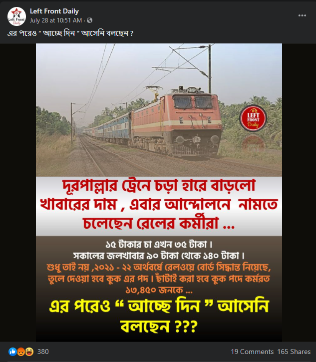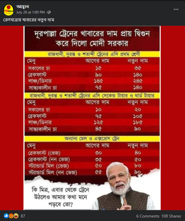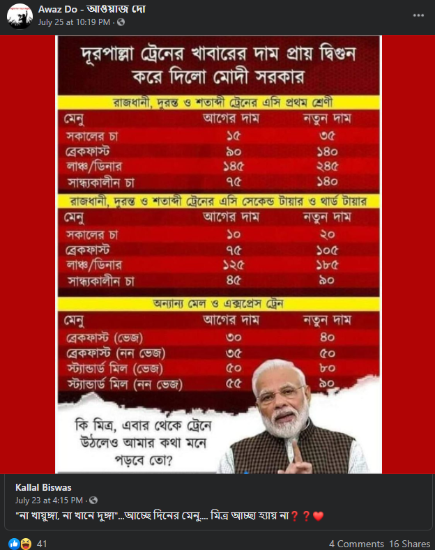 ফেসবুকে কিছু রাজনৈতিক গ্রুপে রেলের খাবারের দাম নিয়ে একটি পোস্ট ছড়িয়েছে যেখানে দাবি করা হয়েছে প্রধানমন্ত্রী নরেন্দ্র মোদীর সরকার স্থাপিত হওয়ার পর থেকে দূরপাল্লার ট্রেনের খাবারের দাম প্রায় নাকি দ্বিগুন করা হয়েছে।