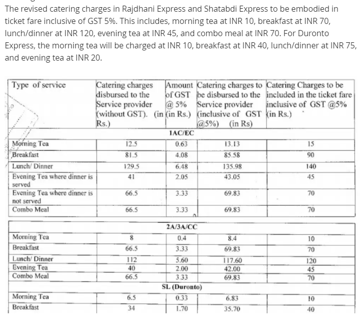 অন্যদিকে ২০১৭ সালে GST চালু হওয়ার পর থেকে রাজধানী, দুরন্ত ও শতাব্দীতেও পরিবেশিত খাবারের দামের পার্থক্য লক্ষ করা গিয়েছিলো। যদিও এর আগে রেল মন্ত্রক থেকে খাবার ছাড়াও টিকিট পাওয়া যাওয়ার মতো পন্থা চালু করেছিল। ২০১৮ সালে GST সমেত খাবারের দাম কি ছিল দেখে নেওয়া যাক-