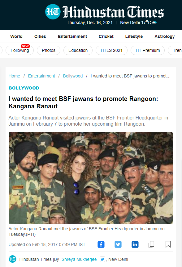 Hindustan Times: https://www.hindustantimes.com/bollywood/i-wanted-to-meet-bsf-jawans-to-promote-rangoon-kangana-ranaut/story-qTgxxgBq1JHTmVIIF4ab4L.html
