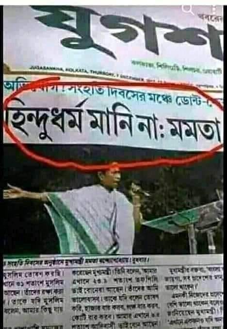 আর কিছুদিনের মধ্যেই শুরু হবে পশ্চিমবঙ্গের বিধানসভা নির্বাচন। এর মাঝে সোশ্যাল মিডিয়াতে ছড়িয়েছে যুগশঙ্খ সংবাদের একটি খবর। যুগশঙ্খের খবর শীর্ষক অনুযায়ী বলা যেতে পারে মমতা হিন্দু ধর্ম মানেন না .