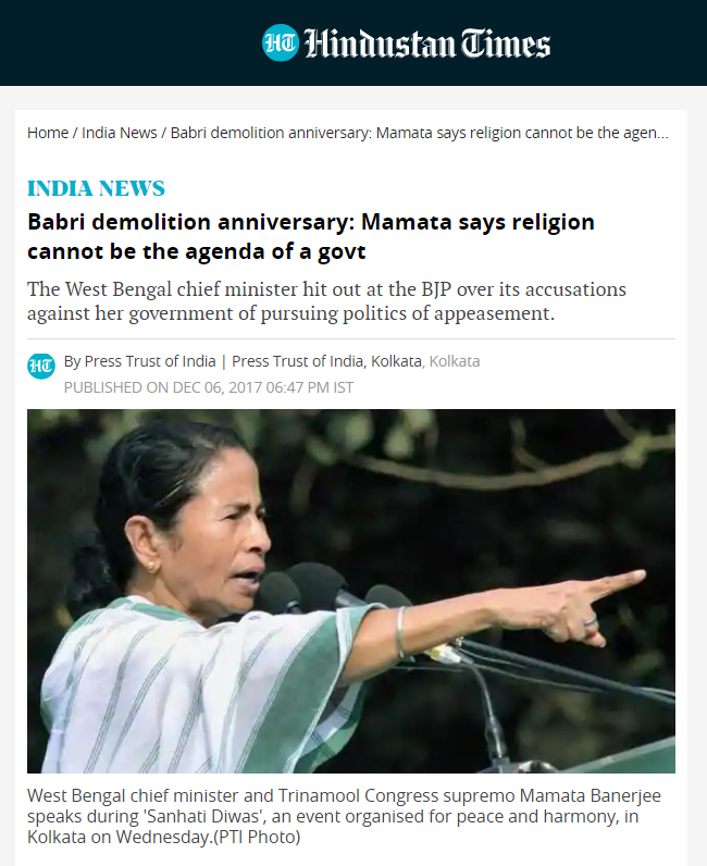 গুগল থেকে কীওয়ার্ড দ্বারা খোঁজার পর Hindustan Times ও Decan Herald এর খবর যা ২০১৭ সালে কলকাতায় সংহতি দিবসের উপর প্রকাশ করা হয়েছে। মমতা ব্যানার্জী জানিয়েছেন তিনি একটি রাজ্যের মুখ্যমন্ত্রী হওয়ার কারণে তার দায়িত্ব রাজ্যের সমস্ত মানুষদের, সব ধর্মাবলম্বীদের সঠিক সুযোগ সুবিধা দেওয়া।