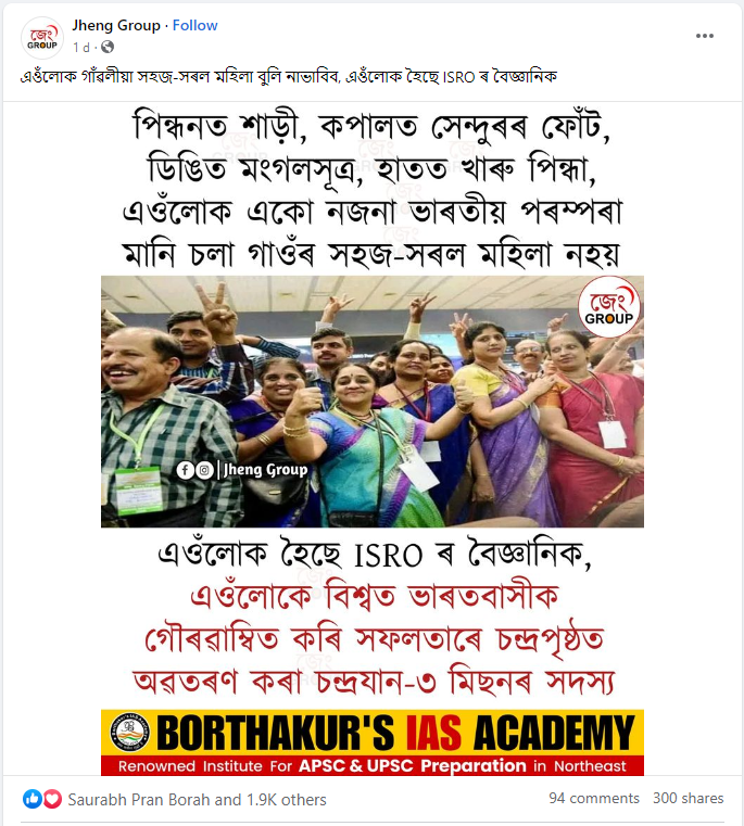 ছবিতে কিছু নারী-পুরুষকে উল্লাস করতে দেখা যাচ্ছে। ছবিটি শেয়ার করে ফেসবুক প্রোফাইলে লেখা রয়েছে, “পোশাকে শাড়ি, কপালে সিঁদুরের ফোঁটা, গলায় মঙ্গলসূত্র, হাতে চুড়ি, এঁরা গ্রামের সাধারণ নারী নন, যাঁরা কিছুই না জেনে ভারতীয় ঐতিহ্য অনুসরণ করেন। এঁরা হলেন ইসরোর বিজ্ঞানী। এঁরা বিশ্বে ভারতবাসীকে গৌরবান্বিত করে সফলভাবে চাঁদের পৃষ্ঠে অবতরণ করা চন্দ্রযান ৩ মিশনের সদস্য।”