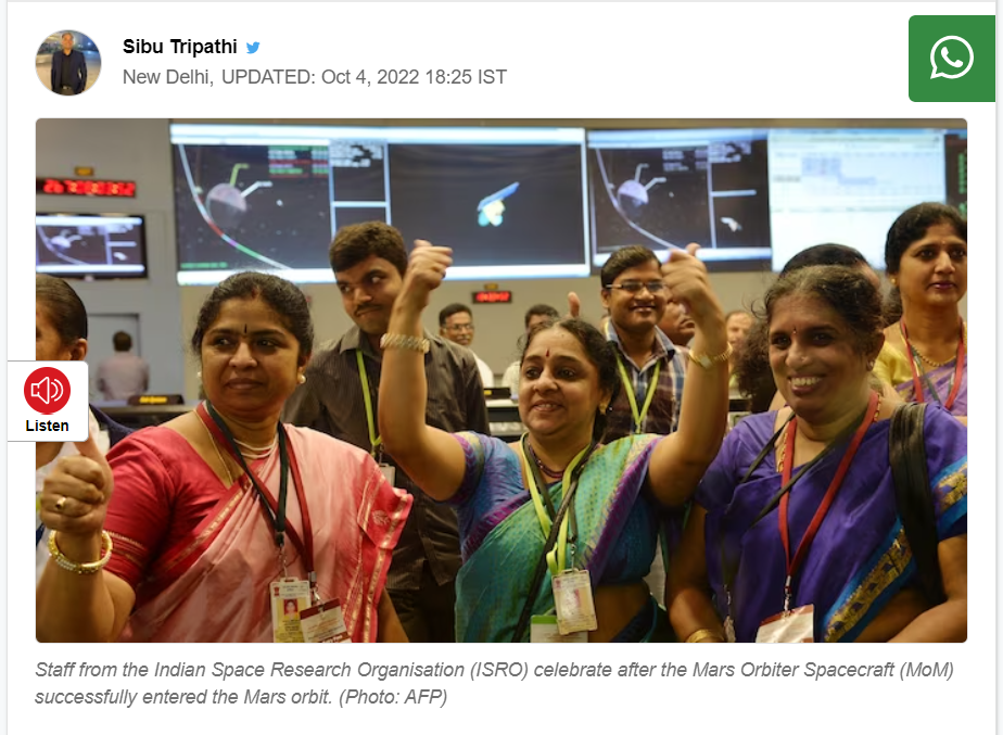 এ ছাড়া, ২০২২ সালের ৪ অক্টোবর India Today ওয়েবসাইটের এক প্রতিবেদনেও এই একই ছবি ভিন্ন কোণ থেকে দেখানো হয়েছে। ক্যাপশনটিও এখানে লেখা আছে – Staff from the Indian Space Research Organisation (ISRO) celebrate after the Mars Orbiter Spacecraft (MoM) successfully entered the Mars orbit. (Photo: AFP) (মঙ্গল অরবিটার মহাকাশযান (এমওএম) সফলভাবে মঙ্গলের কক্ষপথে প্রবেশ করার পরে ভারতীয় মহাকাশ গবেষণা সংস্থার (ইসরো) কর্মীরা উল্লাস প্রকাশ করেছেন। (ছবি: এএফপি)। বিস্তারিত খবরের জন্য এখানে ক্লিক করুন।