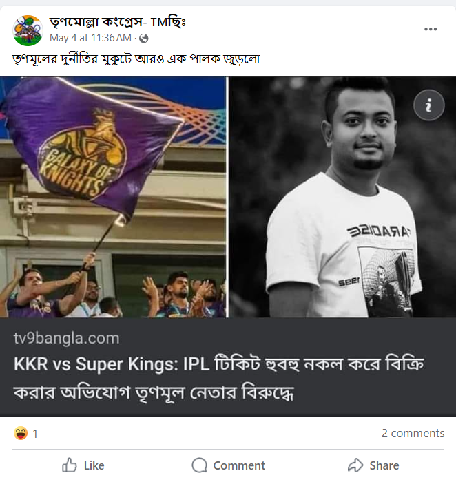 লোকসভা ভোটের উত্তেজনায় টিভি নাইন বাংলায় প্রকাশিত একটি প্রতিবেদনের একটি স্ক্রিনশট ঘিরে সোশ্যাল মিডিয়ায় চর্চা তুঙ্গে। যে প্রতিবেদনের শিরোনাম, ‘kkr vs super kings: ipl টিকিট হুবহু নকল করে বিক্রি করার অভিযোগ তৃণমূল নেতার বিরুদ্ধে’। ওই স্ক্রিনশটটি ফেসবুকে পোস্ট করে লেখা হয়েছে, ‘তৃণমূলের দুর্নীতির মুকুটে আরও এক পালক জুড়লো’। (আর্কাইভ লিঙ্ক)