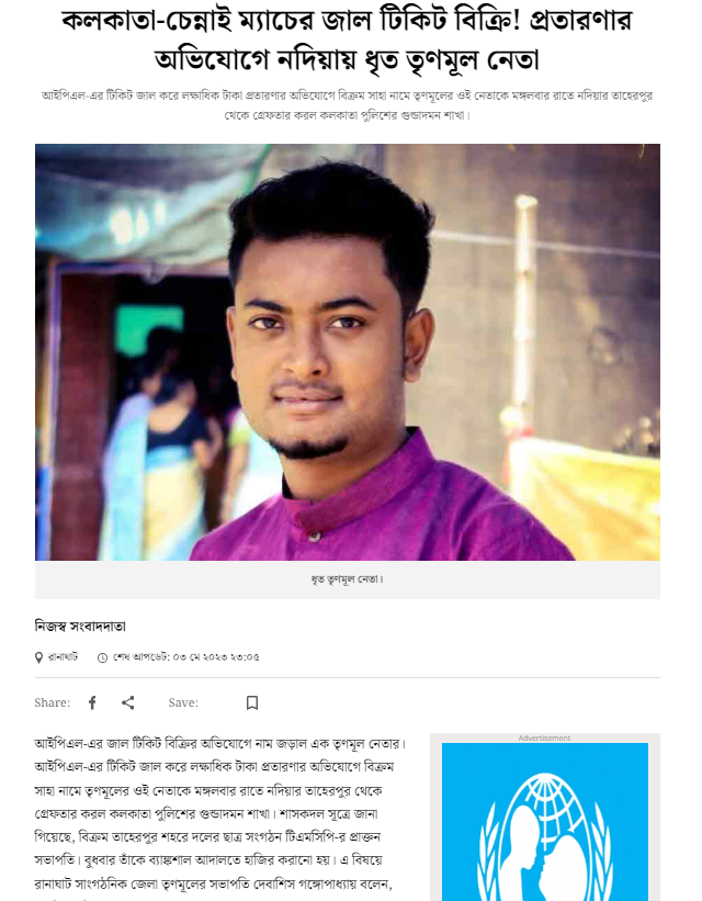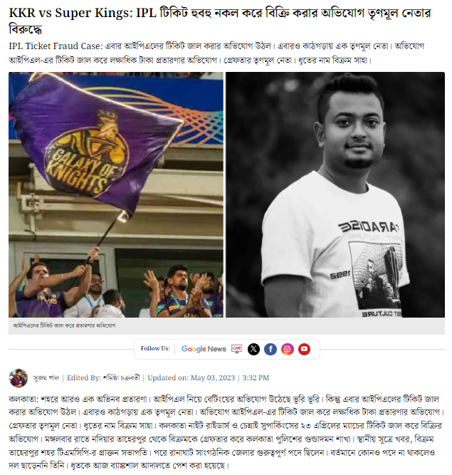 ইন্টারনেটে ভাইরাল স্ক্রিনশটের শিরোনামটি লিখে সার্চ করলে টিভি নাইন বাংলার ওয়েবসাইটে আমরা প্রতিবেদনটি খুঁজে পাই। ২০২৩ সালের ৩ মে যা প্রকাশ করা হয়েছিল। ওই প্রতিবেদন থেকতে জানা যায় যে, কলকাতা নাইট রাইডার্স ও চেন্নাই সুপার র্কিংসের ম্যাচের টিকিট জাল করার অভিযোগ উঠেছিল অভিযুক্তের বিরুদ্ধে। ধৃতের নাম ছিল বিক্রম সাহা। যিনি তাহেরপুর শহর টিএমসিপি-র প্রাক্তন সভাপতি এবং। রানাঘাট সাংগঠনিক জেলার গুরুত্বপূর্ণ পদে ছিলেন।