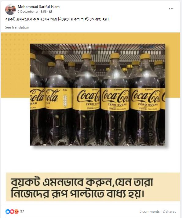 না, এটি কোকাকোলার তৈরি Sugar-Free Lemon Flavour Coca-Cola-এর ছবি। যা তারা ২০২১ সালে বাজারে নিয়ে এসেছিল। ছবিটির সঙ্গে বয়কটের কোনও সম্পর্ক নেই।