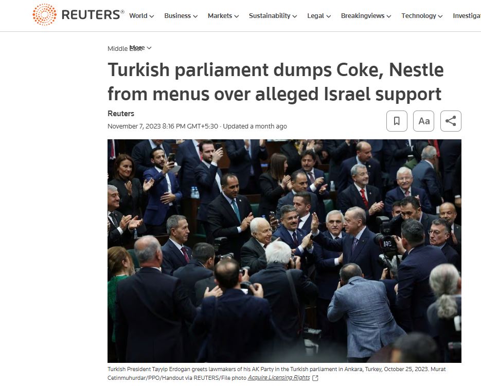 উল্লেখ্য যে ইজরায়েল ও প্যালেস্টাইনের মধ্যে চলতে থাকা সংঘর্ষের মধ্যেই আমেরিকার জর্জিয়া এলাকার আটলান্টায় অবস্থিত বিশ্বের অন্যতম সর্ববৃহৎ পানীয় প্রস্তুতকারক সংস্থা কোকাকোলা ইজরায়েলকে সমর্থন করার অভিযোগে, তুরস্কের সংসদ তাদের রেস্তোঁরা থেকে কোকাকোলা (KO.N) ও নেসলে (NESN.S)-র সব সামগ্রী সরিয়ে দেয়। Reuters-এর এক প্ৰতিবেদন অনুসারে আনুষ্ঠানিক বিবৃতি দিয়ে এ কথা জানানো হয়েছিল। ওই প্রতিবেদন অনুযায়ী, সংসদীয় সূত্র জানিয়েছে যে কোকাকোলা ও নেসলের ইনস্ট্যান্ট কফি মেনু থেকে সরিয়ে দেওয়া একমাত্র ব্র্যান্ড এবং “ইজরায়েলকে সমর্থন করার জেরে এই কোম্পানিগুলির বিরুদ্ধে বিপুল জন-আন্দোলন”-এর প্রতি সমর্থন জানিয়েই ওই সিদ্ধান্ত নেওয়া হয়েছে। অবশ্য এ সম্পর্কে কোকাকোলা কোনও প্রতিক্রিয়া প্রকাশ করেনি বলেও প্রতিবেদনে উল্লেখ করা হয়েছে।