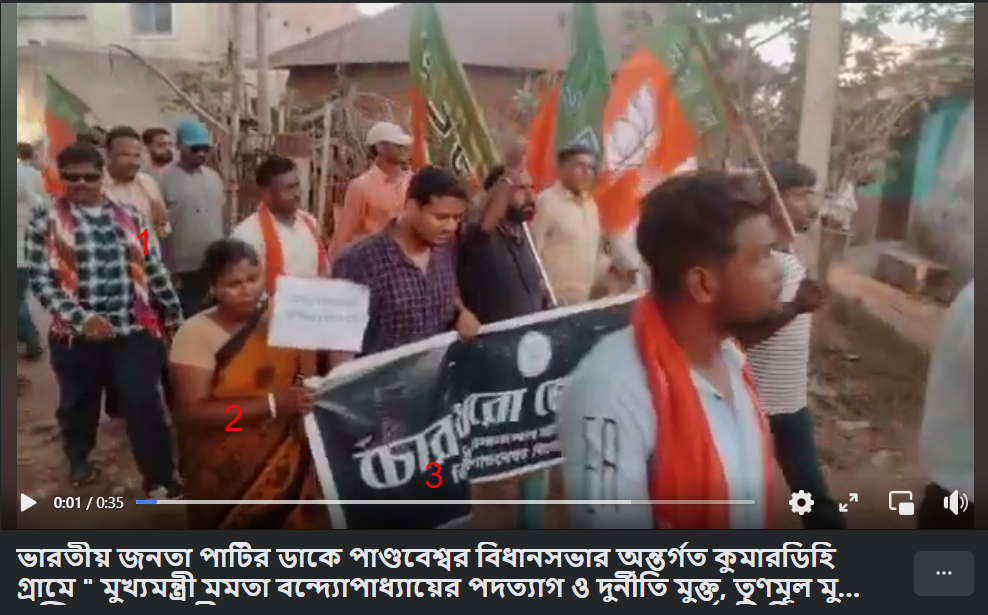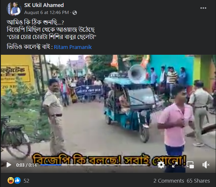 ফেসবুকে কিছুদিন আগে একটি ভিডিও ভাইরাল হয়েছে যেখানে দাবি – বিজেপির বিক্ষোভ মিছিলে শুভেন্দু অধিকারীর বিরুদ্ধে চোর স্লোগান দেওয়া হয়েছে। ভাইরাল ভিডিওতে দেখা যাচ্ছে ‘চোর ধরো, জেল ভরো’ লেখা কালো একটি ব্যানার ও বিজেপির পতাকা হাতে নিয়ে ভারতীয় জনতা পার্টির সমর্থদের মিছিল চলেছে এবং শোনা যাচ্ছে বিরোধী দলনেতা শুভেন্দু অধিকারীর উদ্দেশ্যে স্লোগান – ‘চোর চোর চোরটা শিশির বাবুর ছেলেটা’ .