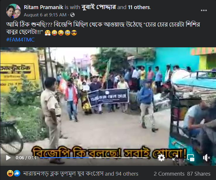 বিজেপির বিক্ষোভ মিছিলে শুভেন্দু অধিকারীর বিরুদ্ধে চোর স্লোগান দেওয়া হয়েছে? সম্পাদিত ভিডিও মিথ্যে দাবি সমেত ভাইরাল ফেসবুকে