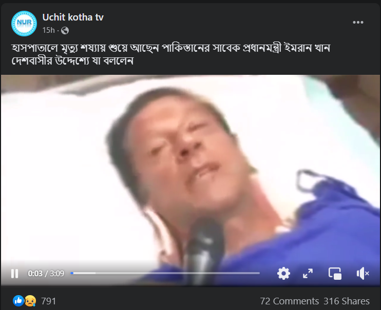 ভিডিওটিকে শেয়ার করে দাবি করা হয়েছে গুলিবিদ্ধ হওয়ার পর হাসতাপালে ভর্তি পাকিস্তানের প্রাক্তন প্রধানমন্ত্রী ইমরান খান। আবার কোথাও লেখা হয়েছে হাসপাতালের মৃত্যুশয্যায় শুয়ে পাকিস্তানের সাবেক প্রধানমন্ত্রী দেশবাসীর উদ্দেশ্যে বার্তা দিলেন।