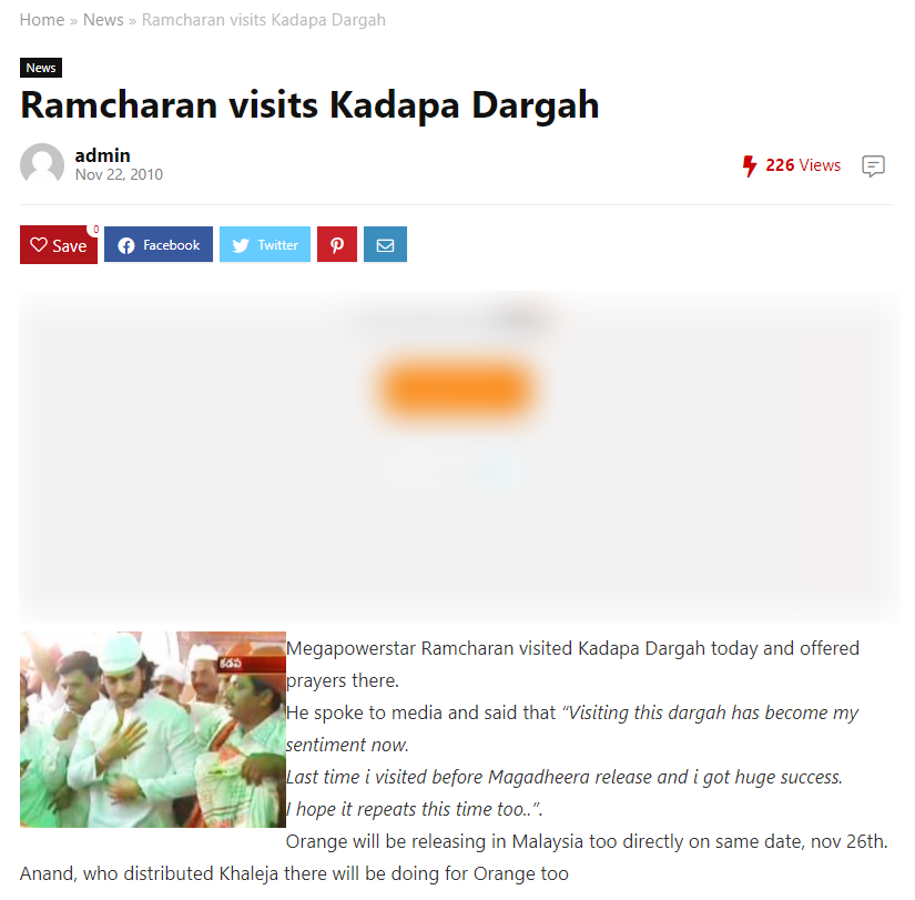 এছাড়াও Telugukey.blogspot.com নামের তেলুগু সিনেমার খবরের ব্লগ থেকেও আমরা রাম চরণের(Ram Charan) কিছু ছবি পাই যা সোশ্যাল মিডিয়াতে ছড়িয়েছে এই দাবিতে যে তিনি ইসলাম ধর্ম গ্রহণ করেছেন। জানা যায় রাম চরণের(Ram Charan) আসন্ন ছবি ‘Orange’ প্রেক্ষাগৃহে আসার আগে তিনি অন্ধ্রপ্রদেশের কাডাপা দরগায় যান, চাদর চড়ান এবং কিছু দিনের মধ্যে আসতে চলা সিনেমার সাফল্যের জন্য প্রার্থনাও করেন।