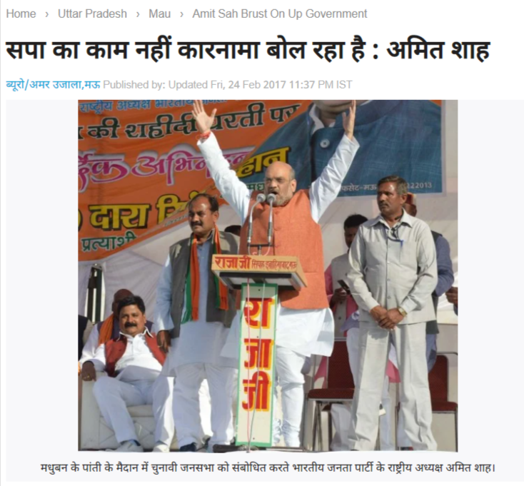 এই খবরের থেকে কীওয়ার্ড বেছে নিয়ে গুগলে খোঁজার পর Amar Ujala র একটি রিপোর্ট পাই যেটি ২০১৭ সালে উত্তরপ্রদেশের বিধানসভা নির্বাচনের সময়ের। নির্বাচনী প্রচারে নেমে অমিত শাহ উত্তরপ্রদেশের তৎকালীন সরকার সমাজবাদী পার্টির বিরুদ্ধে গর্জে ওঠেন। সভা থেকেই তিনি একের পর এক বিষয় নিয়ে আলোচনা করতে শুরু করেন। সমাজবাদী পার্টির সরকার হয়েও উত্তরপ্রদেশে দলিত, গরিব পরিবার অবহেলিত হচ্ছে বলে দাবি করেন শাহ। তার মতে উত্তরপ্রদেশকে যদি গুন্ডাদের হাত থেকে বাঁচাতে হয়, মহিলাদের সুরক্ষা প্রদান করতে হয়,যদি যুব সমাজকে রোজগার দিতে হয় তাহলে পদ্ম ফুলে ভোটটা দিতে হবে।