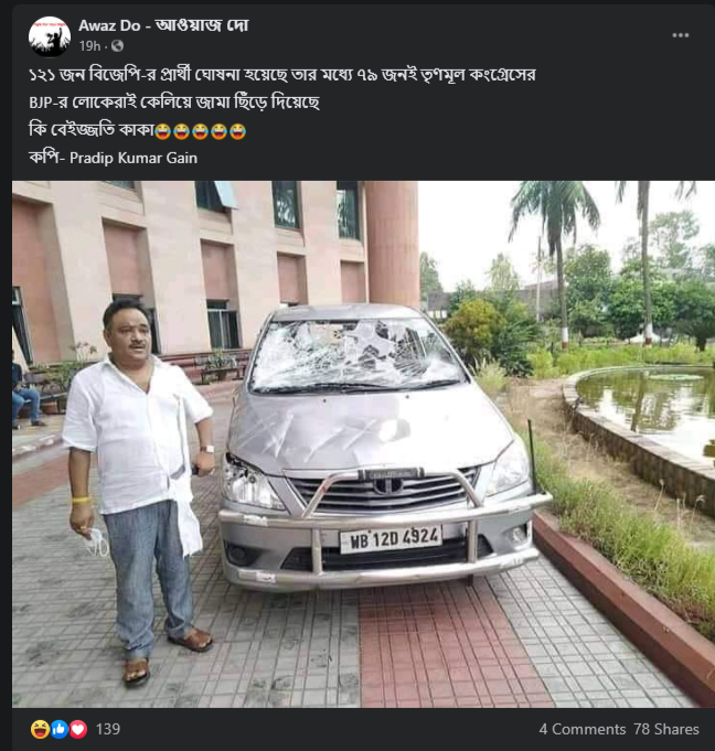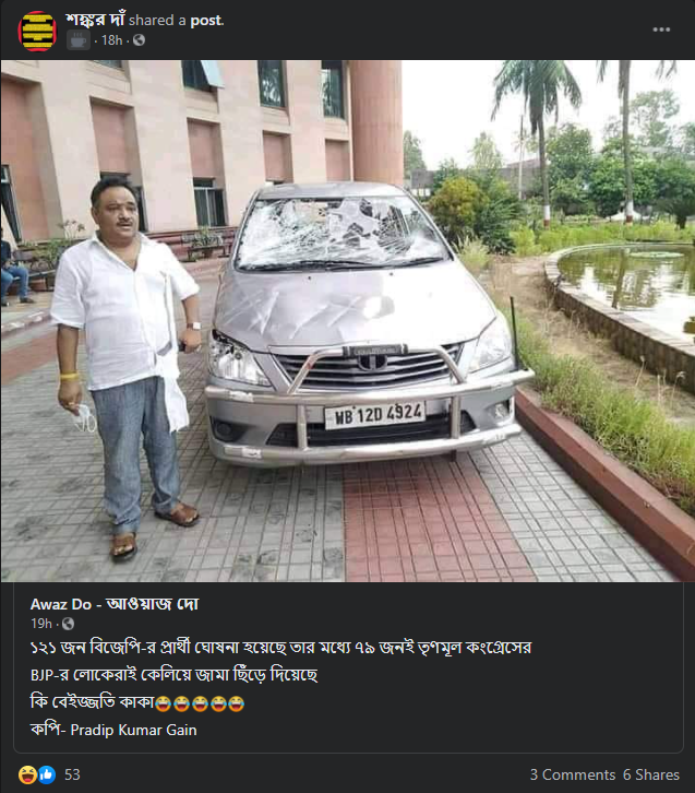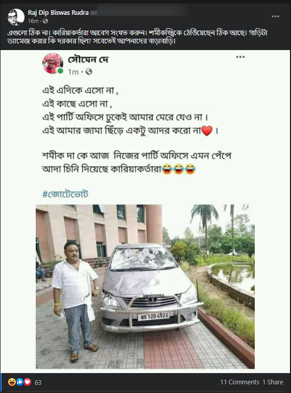 সম্প্রতি সোশ্যাল মিডিয়াতে বসিরহাটের প্রাক্তন বিজেপি বিধায়ক ও বর্তমান প্রধান প্রবক্তা শমীক ভট্টাচার্যের (Samik Bhattacharya) একটি ছবি ভাইরাল হয়েছে। ছবিতে তাকে ছেঁড়া জামা পড়ে এবং প্রায় তছনছ হওয়া গাড়ির সামনে দাঁড়িয়ে দেখা যাচ্ছে। ছবি দেখে স্পষ্টই বোঝা যাচ্ছে ওনার উপর হামলা করা হয়েছে। এই ছবিটি শেয়ার করে বলা হয়েছে বিজেপির ঘোষণা মতে ১২১জন প্রার্থীর মধ্যে ৭৯জনই তৃণমূল কংগ্রেসের। বিজেপির নিজের কর্মীদের প্রার্থী ঘোষণা না করে তার ক্ষেপে গিয়ে চড়াও হয়েছে শমীক ভট্টাচার্যের উপর। তার জামা টেনে ছিঁড়ে দেওয়া হয়েছে এবং গাড়ির কাঁচও ভেঙে দেওয়া হয়েছে।।