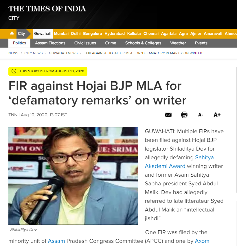 অন্যদিকে শিলাদিত্য দেবের(Shiladitya Dev) সম্পর্কে জানতে পারি সংখ্যালঘু সম্প্রদায়কে নিয়ে উস্কানিমূলক মন্তব্য করার জন্য তিনি বিজেপিতে বেশ চর্চিত ও বিরোধীদের কাছে নিন্দিত। Business Standard, Times of Indiaর প্রকাশিত রিপোর্টে বলা হয়েছে অসমের হোজাই নির্বাচনী এলাকার বিজেপি বিধায়ক শিলাদিত্যের বিরুদ্ধে ২০২০ সালের অগাস্ট মাসে সংখ্যালঘু সম্প্রদায়কে নিয়ে কুরুচিপূর্ণ মন্তব্য করার জন্য পুলিশি ব্যবস্থা নেওয়া হয়। অসমের জনপ্রিয় লেখক সায়েদ আব্দুল মালিককে শিলাদিত্য দেব(Shiladitya Dev) ‘শিক্ষিত জিহাদির’ আখ্যা দেওয়ার পর অসমের বিভিন্ন সংখ্যালঘু গোষ্ঠী থেকে ওনার বিরুদ্ধে আইনি ব্যবস্থা নেওয়া হয়। শিলাদিত্যয়ের এই মন্তব্যের জেরে ওনার উপর ক্ষেপে ওঠেন অসম বিজেপির নেতা ও অসম সংখ্যালঘু উন্নয়নের চেয়ারম্যান মুমিনুল আওয়াল সবার সামনে দাঁড়িয়ে এই মন্তব্যের জন্য শিলাদিত্য দেবের(Shiladitya Dev) ক্ষমা চাওয়ার দাবি করেন। শুধু তাই নয়, ওনার এই ধরণের উস্কানিমূলক কথাবার্তার জন্য বিরোধী পক্ষ কংগ্রেস তাকে ‘পাগল মানুষ’ এমনকি বিজেপির রাখি সাওয়ান্ত বলেও আখ্যা দিয়েছে।