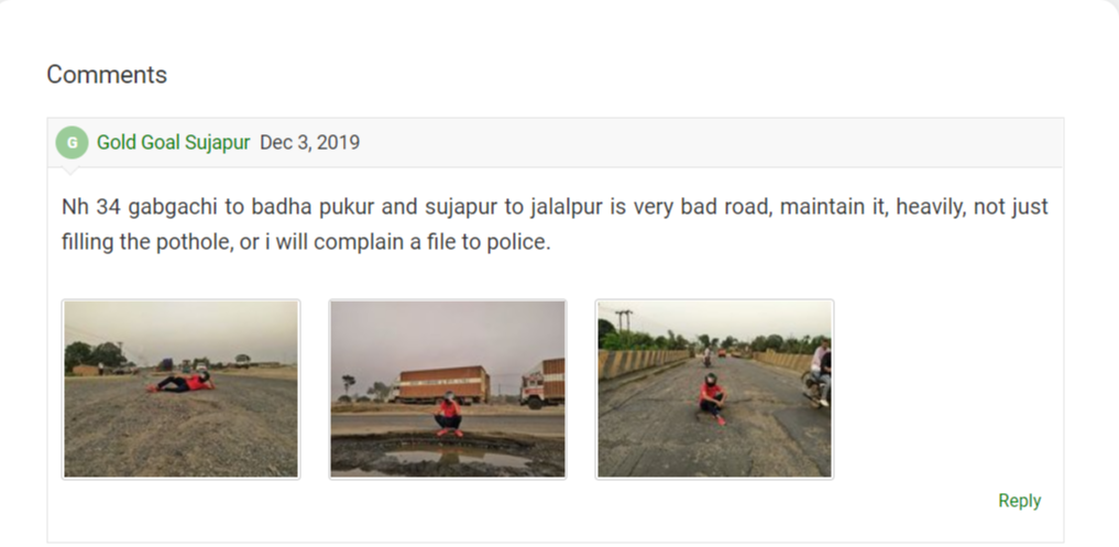 আমরা এই ছবিগুলোর কিছু লিংক পাই Consumer Complaints নামের সাইট থেকে। সাধারণত ভারতীয় গ্রাহকগণ এখানে যেকোনো পরিষেবা বা কোনো বস্তু নিয়ে অভিযোগ জানাতে পারে। এই স্থানে এই ছবিগুলো দেওয়া হয়েছে ২০১৯ সালের নভেম্বর মাসে এবং লেখা হয়েছে গাবগাছি ও জালালপুরের উপর দিয়ে চলে যাওয়া জাতীয় সড়ক ৩৪এর দুর্দশার কথা লেখা হয়েছে।