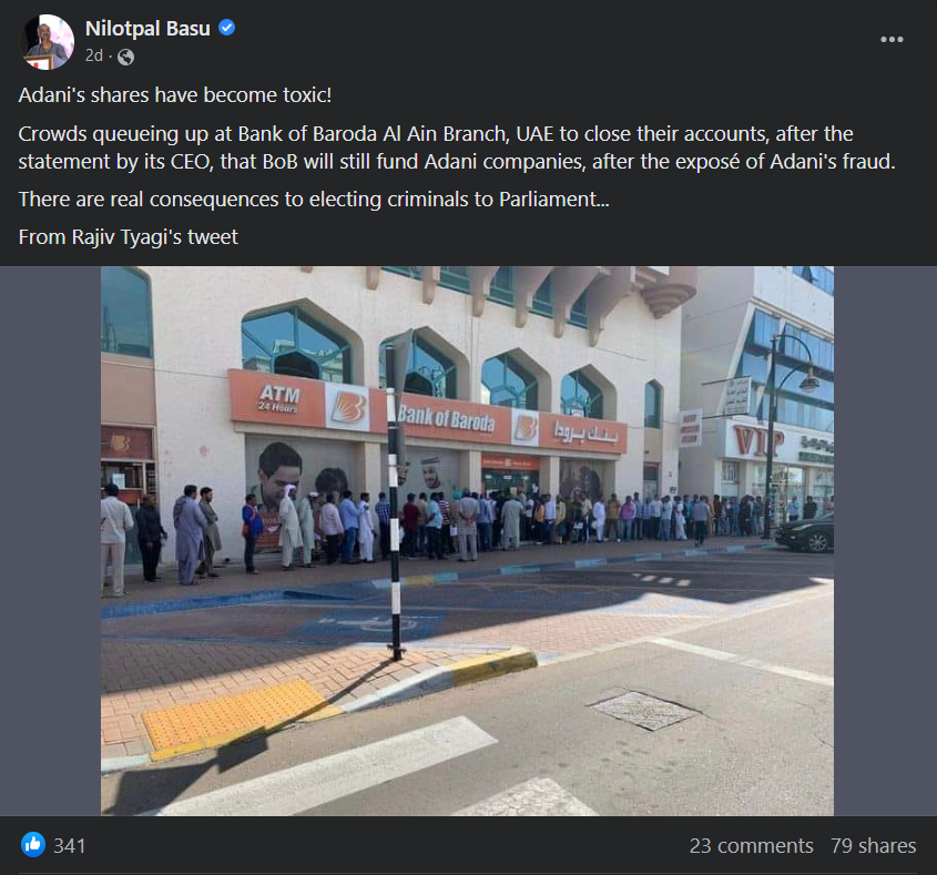Claim: ধনকুবের গৌতম আদানির সপক্ষে থাকার কারণে আরব আমিরশাহির ব্যাঙ্ক অফ বরোদায় নিজেরদের খাতা বন্ধ করার জন্য ভিড় করেছে গ্রাহকরা