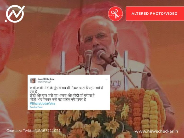 আমাদের অনুসন্ধানে প্রমাণিত হয়েছে ফেসবুক ও টুইটারে ভাইরাল দাবি প্রধানমন্ত্রী নরেন্দ্র মোদি কংগ্রেসের প্রশংসা করেছেন এই দাবি সমেত যে ভিডিওটি ছড়িয়েছে সেটি সম্পূর্ণ সম্পাদিত। আসল ভিডিওতে প্রধানমন্ত্রী এই ধরণের কোনো মন্তব্য করেননি।
