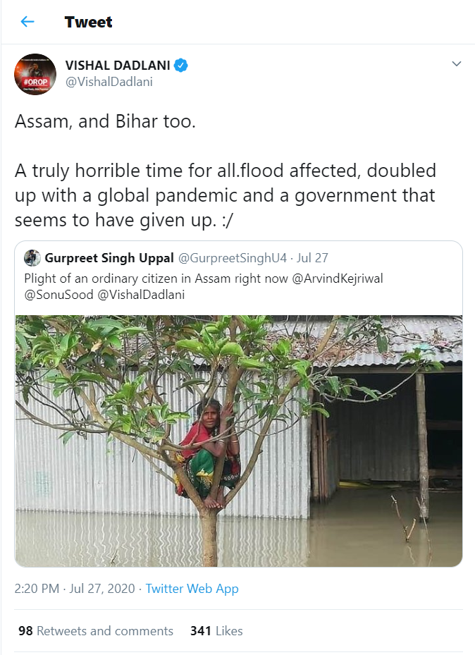 বিখ্যাত সুরকার ও গায়ক ভিশাল দাদলানিও এই ছবিটি শেয়ার করছেন টুইটারে এবং অসম ও বিহারের দুর্যোগের প্রতি সহানুভূতি জানিয়েছেন।