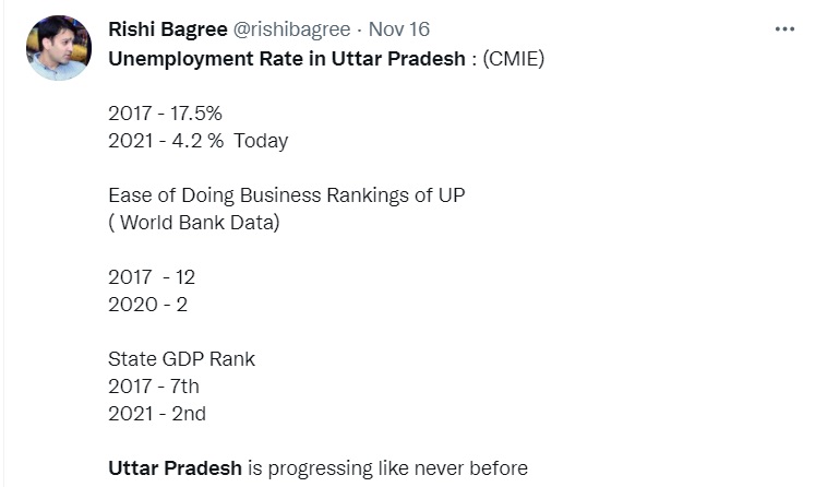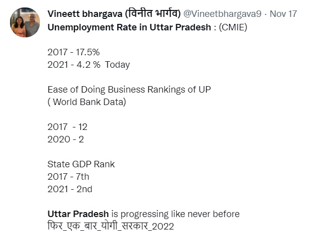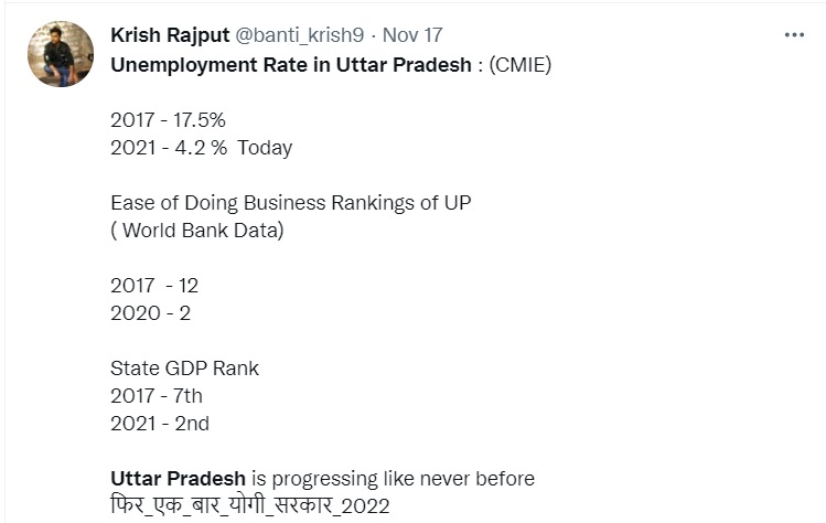 সম্প্রতি টুইটারে উত্তর প্রদেশের মুখ্যমন্ত্রী যোগীকে নিয়ে একটি পোস্ট ভাইরাল হয়েছে যে যখন যোগী আদিত্যনাথ যখন মুখ্যমন্ত্রীত্ব নিয়েছিলেন তখন উঃ প্রঃ বেকারত্ব ১৭% ছিল, এবং তিনি পদ গ্রহণ করার পর সেই পরিমান ৪.২% তে এসে দাঁড়িয়েছে।