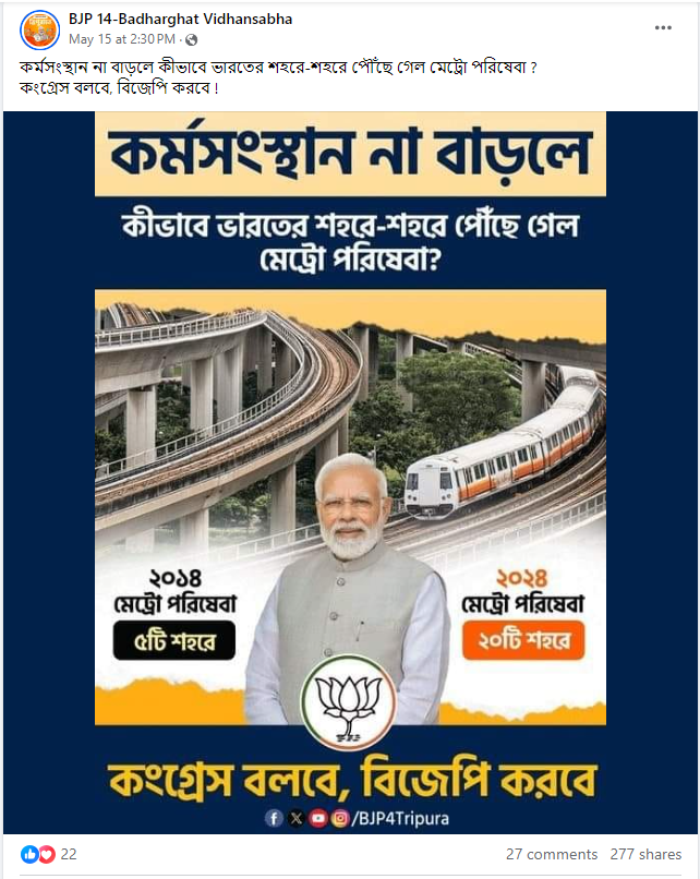 সোশ্যাল মিডিয়ায় ঘুরছে বিজেপি সরকারের মেট্রো পরিষেবা সংক্রান্ত একটি বিজ্ঞাপন। যেখানে দেখানো হয়েছে নরেন্দ্র মোদির আমলে দেশের ‘মেট্রো পরিষেবার অগ্রগতি’ এবং সেখানে প্রধানমন্ত্রীর ছবি-সহ লেখা হয়েছে, “কর্মসংস্থান না বাড়লে কীভাবে ভারতের শহরে-শহরে পৌঁছে গেল মেট্রো পরিষেবা? কংগ্রেস বলবে, বিজেপি করবে”। একই দাবি সহযোগে বিজ্ঞাপনের ছবিটি অনেকেই ফেসবুকে পোস্ট করেছেন। (আর্কাইভ লিঙ্ক)