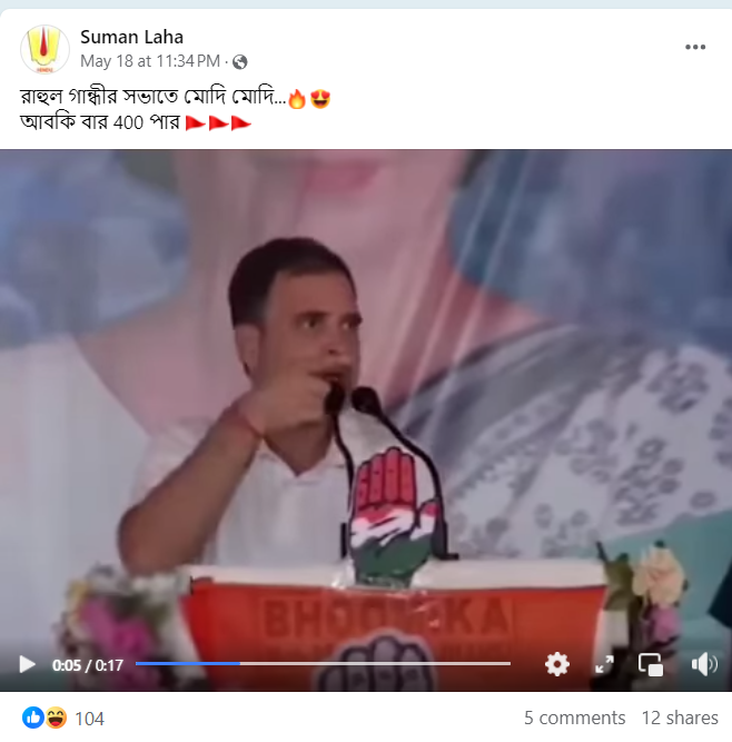 সোশ্যাল মিডিয়ায় ভাইরাল একটি ভিডিয়োতে মঞ্চের উপর রাহুল গান্ধীকে বক্তৃতা দিতে দিতে হঠাৎই থেমে যেতে শোনা দেখা যায়। কারণ পরক্ষণেই “মোদি…মোদি…” স্লোগান শুনতে পাওয়া যায়। এরপর কংগ্রেস নেতাকে বলতে শোনা যায়, “যত পারো মোদির ছবি দেখাও, আমাদের কিচ্ছু যায় আসে না।” ভিডিয়োটি ফেসবুকে পোস্ট করে অনেকেই দাবি করেছেন, “রাহুল গান্ধীর সভাতে মোদি মোদি…আবকি বার 400 পার”। (আর্কাইভ লিঙ্ক)