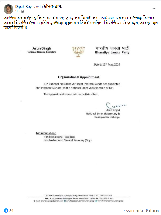 জে পি নাড্ডা ও বিজেপির নাম-সহ সোশ্যাল মিডিয়ায় ছড়িয়ে পড়েছে একটি ঘোষণাপত্র। যেখানে লেখা রয়েছে, ভোটকুশলী তথা ‘জন সূরজ অভিযান’-এর প্রতিষ্ঠাতা প্রশান্ত কিশোরকে নয়া মুখপাত্র নির্বাচিত করেছে বিজেপি। ওই চিঠিটি ফেসবুকে পোস্ট করে লেখা হয়েছে, “আইপ্যাকের বা প্রশান্ত কিশোর এই রাজ্যে তৃনমূলের নিয়োগ করা ভোট ম্যানেজার! সেই প্রশান্ত কিশোর আবার বিজেপির প্রধান জাতীয় মুখপাত্র। মুকুল রায় ঠিকই বলেছিল- বিজেপি মানেই তৃনমূল, আর তৃনমূল মানেই বিজেপি!” (আর্কাইভ লিঙ্ক)