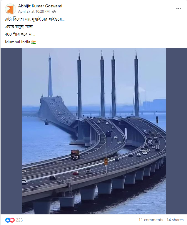 সোশ্যাল মিডিয়ায় ছড়িয়েছে সুবিশাল একটি উড়ালপুলের ছবি। যা পোস্ট করে অনেকেই দাবি করেছেন যে, ব্রিজটি মুম্বইয়ের। ফেসবুকে লেখা হয়েছে, “এটা বিদেশ নয়,মুম্বাই এর হাইওয়ে…এবার বলুন,কেন 400 পার হবে না…”। (আর্কাইভ লিঙ্ক)