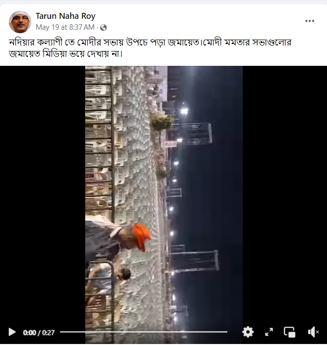 নির্বাচনী আবহে নরেন্দ্র মোদির সভার ফাঁকা দর্শকাসনের একটি ভিডিয়ো ফেসবুকে পোস্ট করে কটাক্ষের সুরে লেখা হয়েছে, “নদিয়ার কল্যাণী তে মোদীর সভায় উপচে পড়া জমায়েত।মোদী মমতার সভাগুলোর জমায়েত মিডিয়া ভয়ে দেখায় না।”