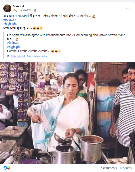 ভোটের বাজারে সোশ্যাল মিডিয়ায় চক্কর কাটছে মুখ্যমন্ত্রী মমতা বন্দ্যোপাধ্যায়ের একটি ছবি। যেখানে তাঁকে রাস্তার ধারে একটি চায়ের দোকানে চা বানাতে দেখা যাচ্ছে। ছবিটিকে সাম্প্রতিক বলে দাবি করেছেন সোশ্যাল মিডিয়ার একাংশ। ফেসবুকে হিন্দিতে লেখা হয়েছে, “এবার আমি প্রধানমন্ত্রী হয়েই থামব।” (আর্কাইভ লিঙ্ক)
