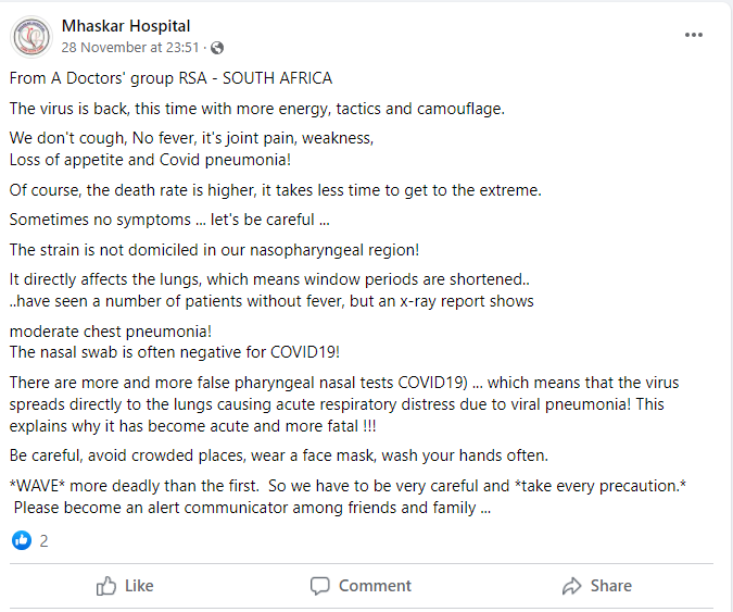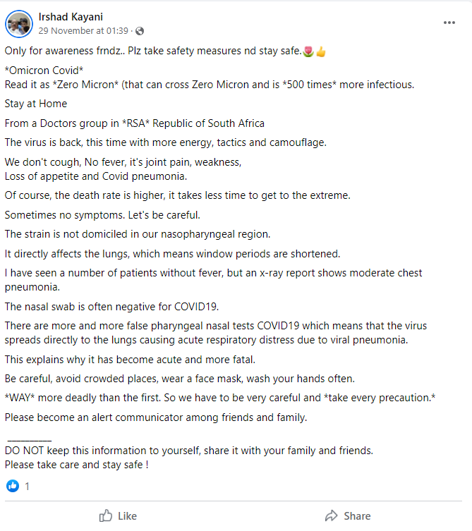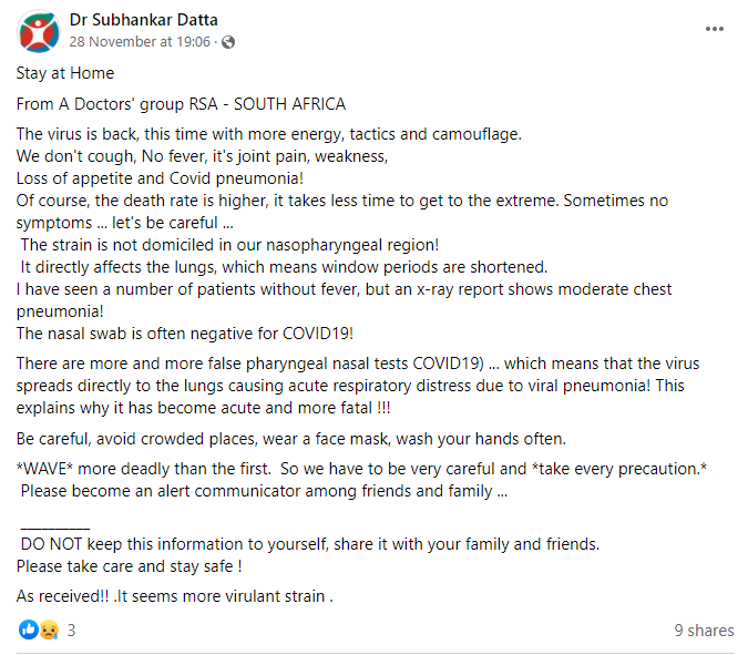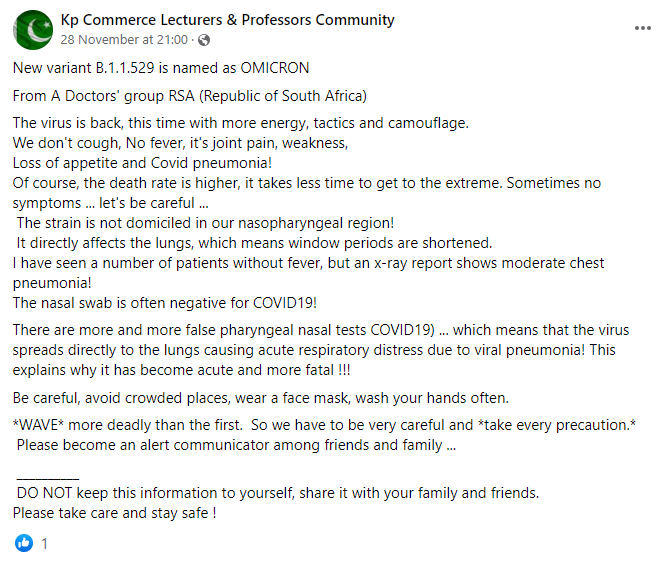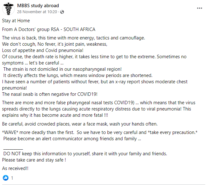 The forward, allegedly from a doctor’s association in South Africa claims, “the nasal swab” for the Omicron variant “is often negative for COVID19.”