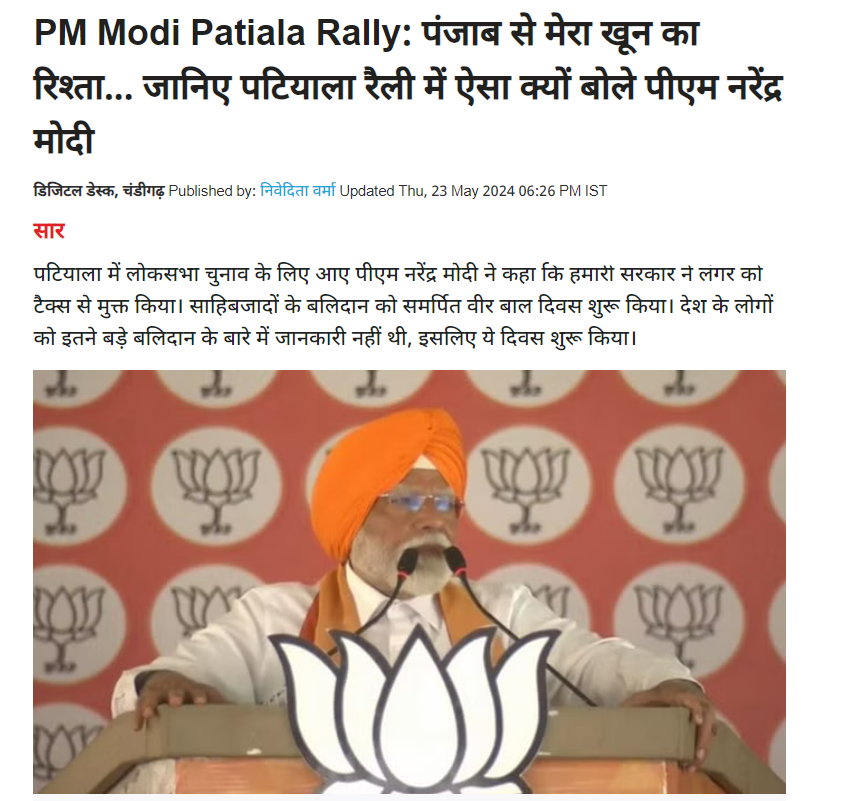 We also found an Amar Ujala report, dated May 23, 2024, detailing a campaign rally by the PM in Patiala, which said “PM Modi said that he has blood relations with Punjab. One of the ‘Panch Pyare’ of Guru Gobind Singh was from Dwarka.”