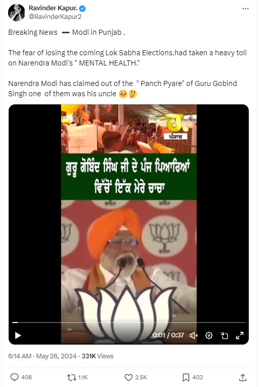 Multiple X users shared the 37-second-long-footage alleging that PM Modi claimed that one of the ‘Panch Pyare’ was his uncle and insinuated that the PM made such an outlandish claim in an attempt to win over the Sikh voters.