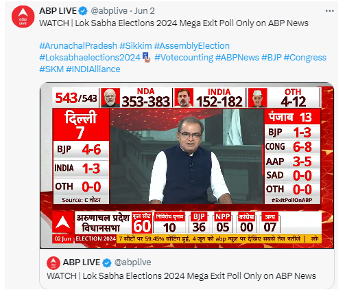 A 23 second long video showing an ABP news report discussing the exit poll results purportedly showing the INDI alliance in lead has grabbed social media attention. The graphic text in the footage claims that the exit polls predicted 353-383 seats for the INDI bloc, and 152-182 for the NDA in the 2024 Lok Sabha Elections.