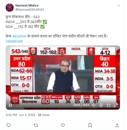 Multiple X users shared the video claiming that the exit poll data shows the INDI bloc in lead in 2024 General Elections.