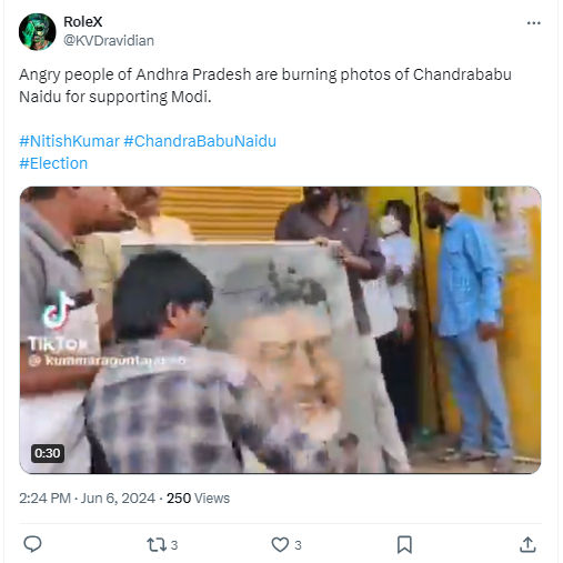 Multiple social media users shared the 33-second-long-footage claiming, “Angry people of Andhra Pradesh are burning photos of Chandrababu Naidu for supporting Modi.”