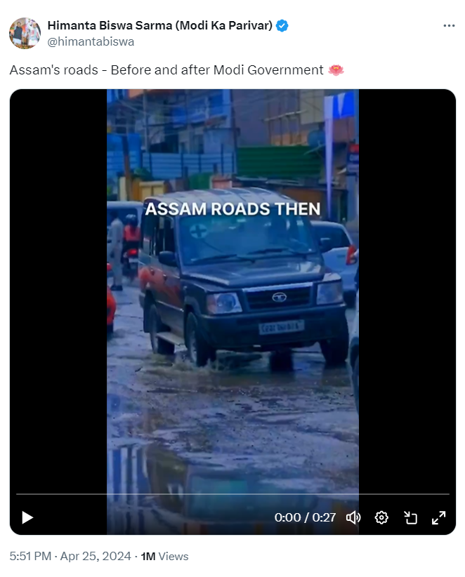 On April 25, Assam Chief Minister Himanta Biswa Sharma took his X handle to share a 27-second video supposedly to show the contrasting visuals of development during the BJP rule and poor infrastructure from his predecessor’s time. The viral clip in the initial few seconds shows cars plying on potholes-ridden roads. The caption of this part of the video reads, “Assam roads then”. The other portion of the video clip shows swanky roads, highways and bridges with the caption “ Assam roads now”. Posting the video CM Himanta Biswa Sharma wrote, “Assam’s roads – Before and after Modi Government”. (Archive Link)