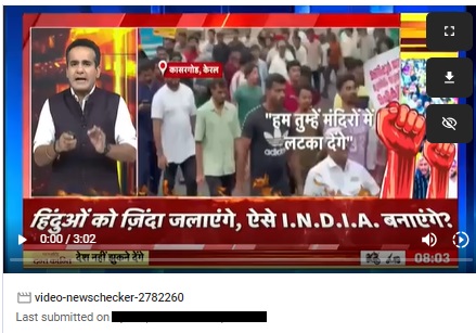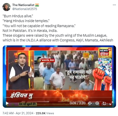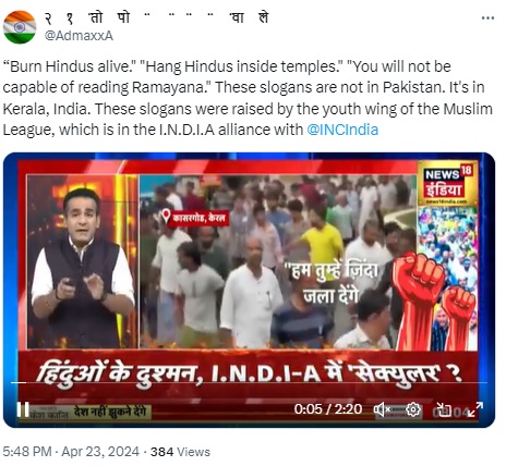 Several social media users are sharing a 3:02-minute video, purportedly of a News18 India report on a protest in Kerala, which will see all 20 Lok Sabha constituencies go to polls on April 26 in the second phase of the general elections. According to the anchor, Aman Chopra, and the claims that are going viral on social media, anti-Hindu slogans were raised by the youth wing of the Indian Union Muslim League (IUML), a longtime partner of the Congress-led United Democratic Front in Kerala and a member of the Opposition’s INDIA alliance.