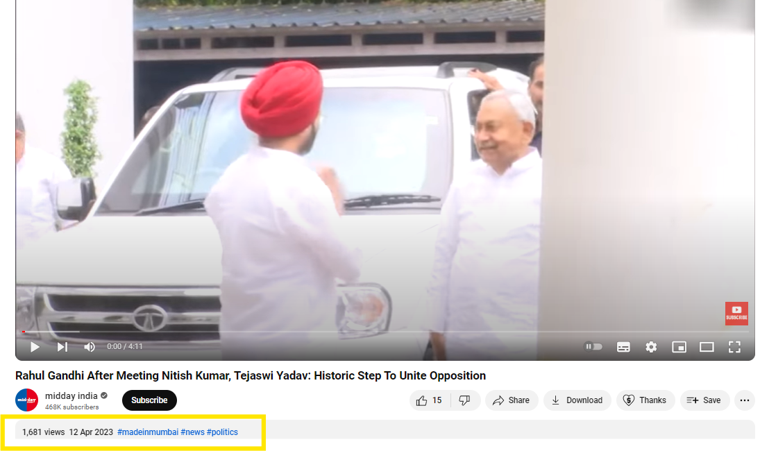 A keyword search for “Nitish Kumar,” “Tejashwi Yadav,” “meets” “Rahul Gandhi,” and “Mallikarjun Kharge” on Youtube led us to a report by Midday India, dated April 12, 2023. Carrying snippets from the viral footage, the report elaborated on a meeting of the Congress leaders with Nitish Kumar and Tejashwi Yadav at Mallikarjun Kharge’s residence.