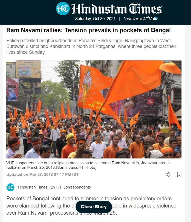 Another reverse image search of this image led us to a Hindustan Times article captioned “Ramnavami rallies: Tension prevails in parts of Bengal”. The image description reveals that it is from Jadavpur area of Kolkata and shows VHP supporters taking out a religious procession to celebrate Ramnavami and nowhere related to violence in Tripura.