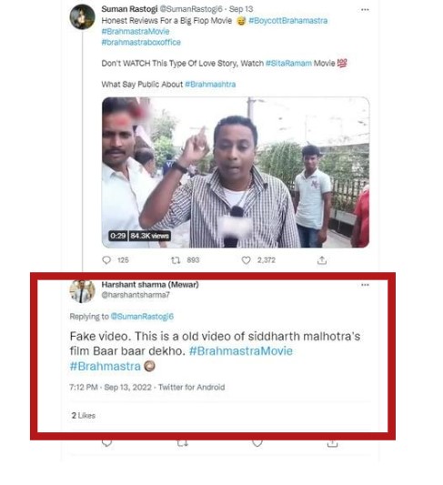 Notably, portions from the original video where ‘reviewers’ can be heard saying “Baar Baar Dekho,” or “Kala Chasma” have been edited out in the viral clip to mislead people into believing that it shows the public’s reaction to Brahmastra.
