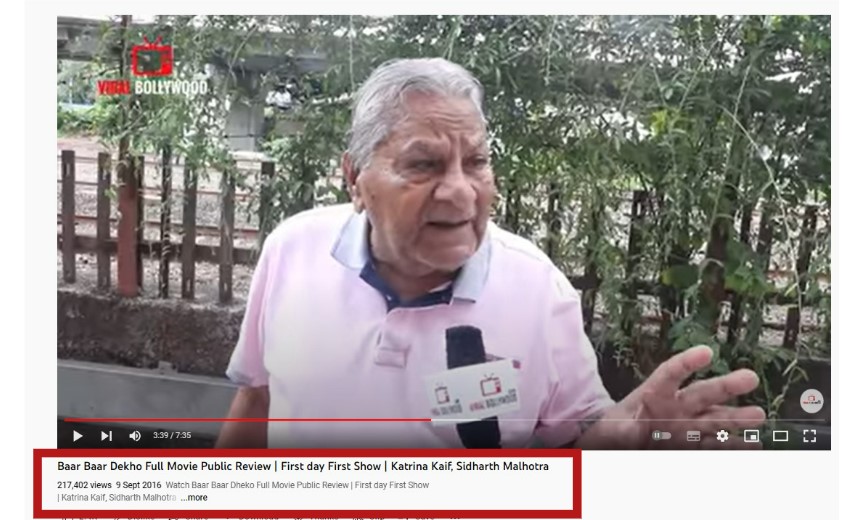 In the pictures we noticed ‘Viral Bollywood’ written on the mike, which has been blurred out in the viral video. Following this, we looked up “Baar Baar Dekho Review” on the official YouTube channel of Viral Bollywood which yielded a video uploaded on September 9, 2016. Titled ‘Baar Baar Dekho Full Movie Public Review | First day First Show | Katrina Kaif, Sidharth Malhotra,’ the 7-minute-35-second-long video featured extended versions of the snippets seen in the viral video.