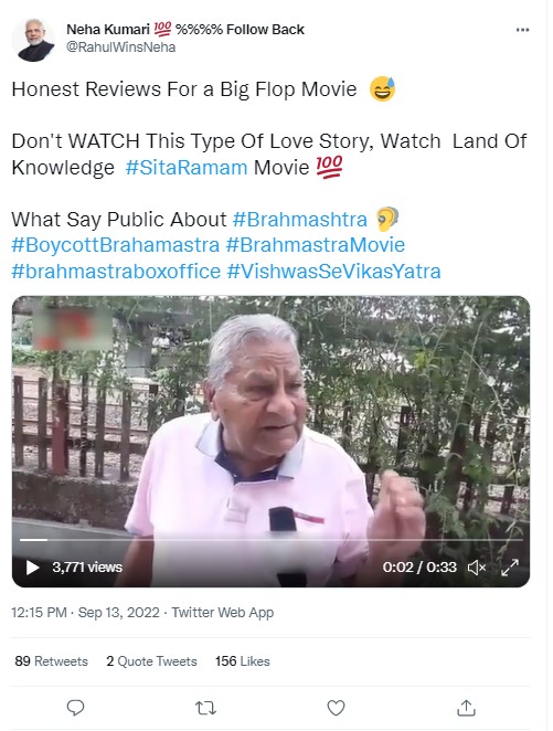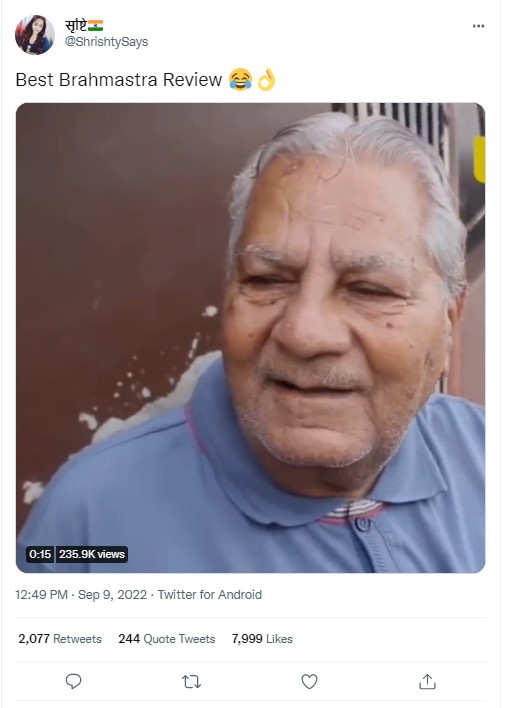 Another video claiming to show a disappointed elderly man’s review of Brahmastra has also been doing the rounds on social media platforms since the day of the release.