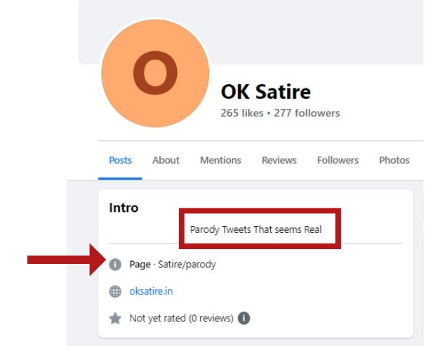The introduction to the Facebook page read, “Parody Tweets That seems Real” and it has been categorised as “ Satire/parody.”