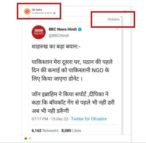 A quick scan through the posts featured in Ok Sarire’s page helped us to spot the alleged screengrab of the BBC Hindi tweet claiming that Shah Rukh Khan called Pakistan his second home. The image was shared on Facebook by the satire page on December 15, 2022.
