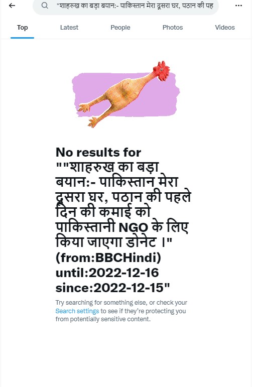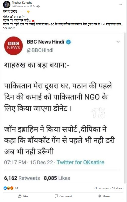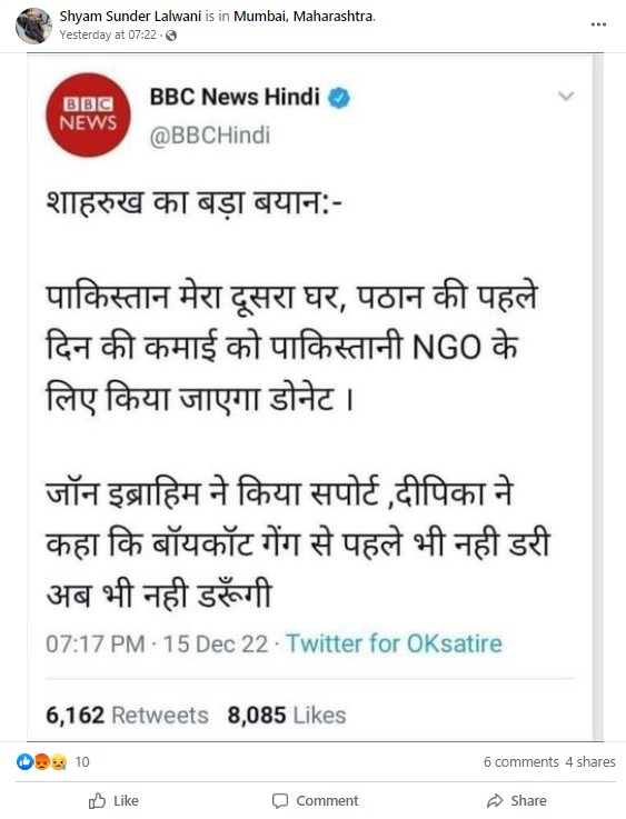 We scanned through the Twitter feed of the official account of BBC News Hindi, but did not find any such tweet. A Twitter advanced search for exact phrase seen in the viral image (शाहरुख का बड़ा बयान:- पाकिस्तान मेरा दूसरा घर, पठान की पहले दिन की कमाई को पाकिस्तानी NGO के लिए किया जाएगा डोनेट । ) also did not yield any post by the news outlet.