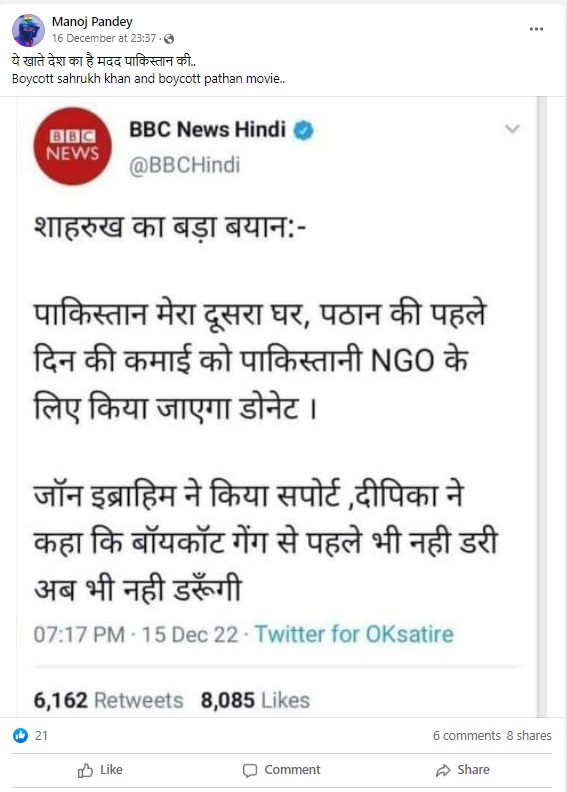 Amid the ongoing controversy around YRF’s upcoming movie Pathaan, an alleged screengrab of a tweet by BBC Hindi carrying “Big statement” by Shah Rukh Khan has grabbed the attention of social media users. The text in the viral image states that Khan called Pakistan his second home, and said that the first day collection of Pathaan will be donated to a Pakistani NGO. The alleged tweet further reads, “John Abraham extended his support to it. Deepika said that she was not afraid of the boycott gang before, and will not be afraid even now.”