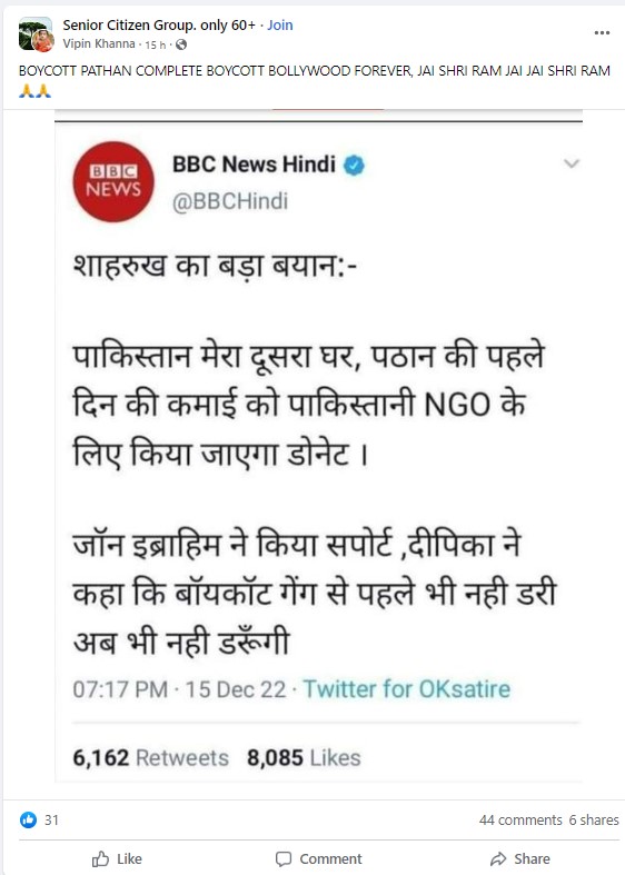 We could thus conclude that an alleged screengrab from a BBC Hindi tweet claiming that Shah Rukh Khan called Pakistan his second home, and expressed his intentions of donating the first day collection of Pathaan movie to a Pakistani NGO actually originated from a satire page.