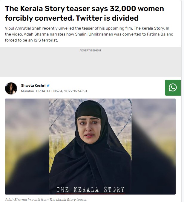A Cinema Express report quoted writer-director Sudipto Sen claiming , “As per a recent investigation, since 2009 – nearly 32,000 girls from Kerala and Mangalore from Hindu and Christian communities have been converted to Islam and most of them end up landing in Syria, Afghanistan, and other ISIS and Haqqani influential areas…”