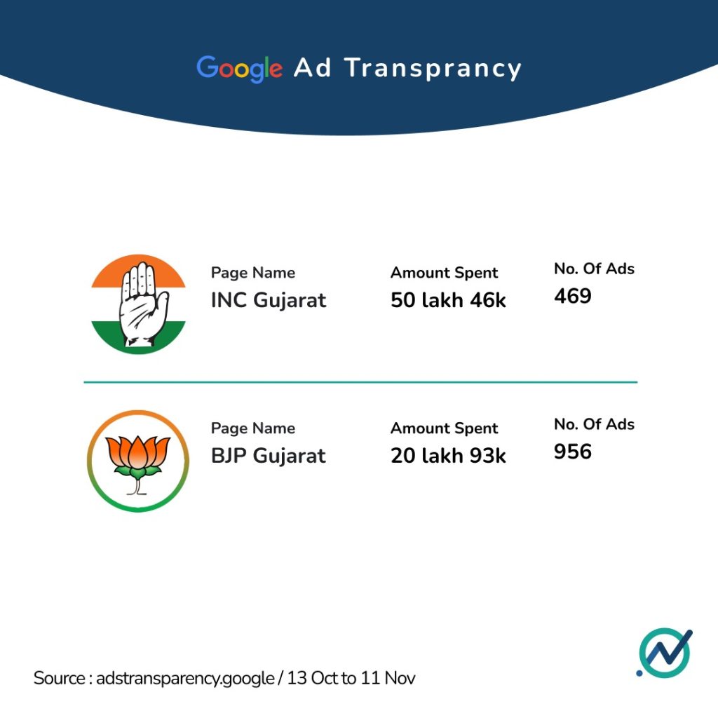 On analysing the Google adspend data, which reveals the spending on political advertisements on different websites, from October 13 to November 11, we find that the BJP ran more than 900 advertisements related to the elections, spending over 20 lakhs for the same. During the same period, Congress has spent 50 lakhs on more than 400 advertisements.